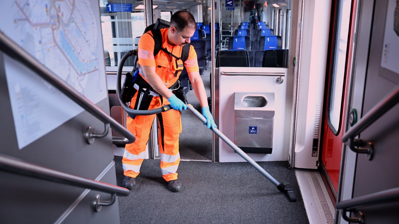 Dass sich die Fahrgäste in unseren Bahnhöfen und Zügen wohlfühlen, ist uns besonders wichtig. Dafür leistest du mit deiner Arbeit einen grossen Beitrag. Denn als Reiniger:in machst du mehr als nur sauber. Mit hochwertigen Reinigungsprodukten und -geräten sorgst du für Hygiene sowie einen positiven Gesamteindruck unserer Züge und Bahnhöfe.